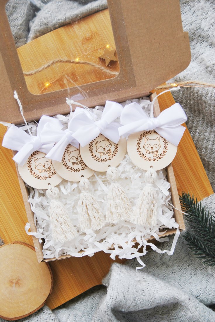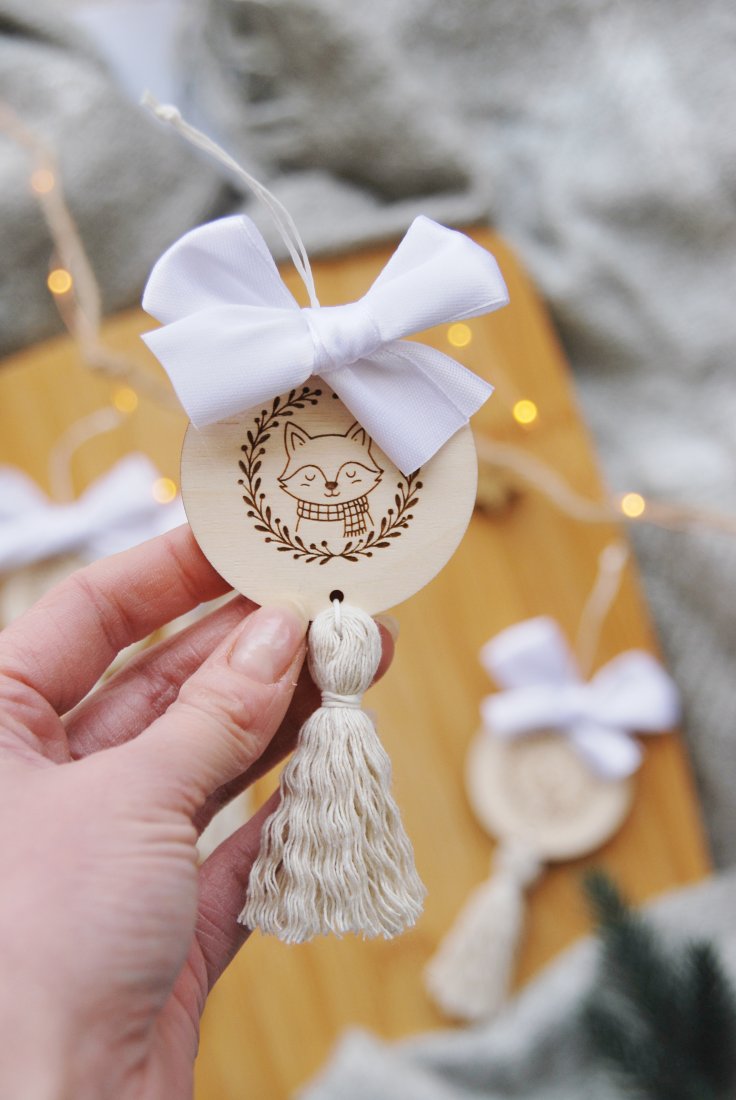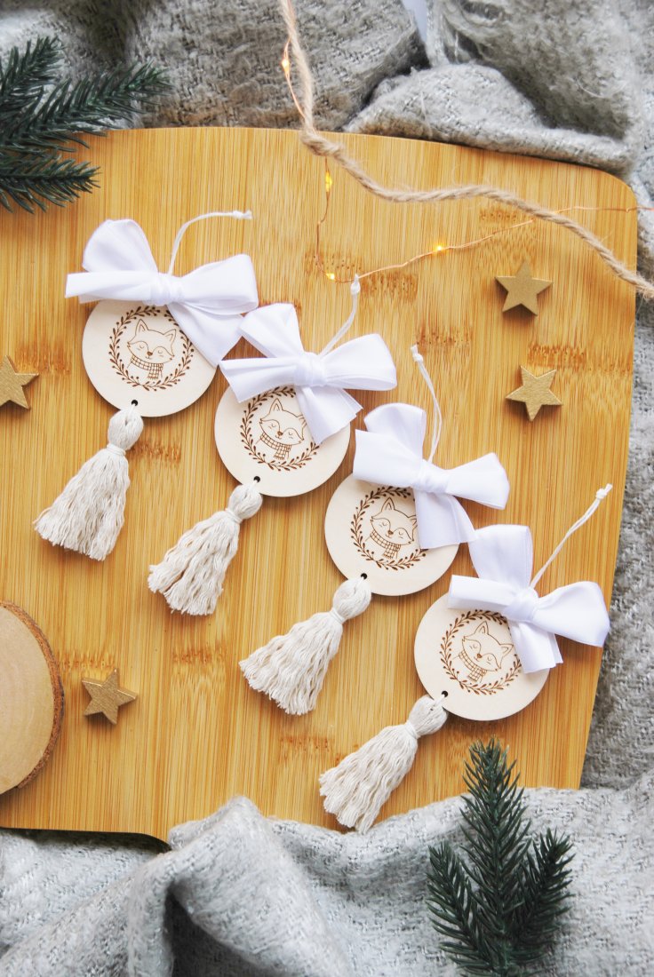 Uroczy zestaw czterech ręcznie wykonanych zawieszek choinkowych z chwostami i białymi kokardkami. Każda ozdoba składa się z drewnianego medalionu z delikatnym, grawerowanym motywem świątecznym oraz miękkiego, dekoracyjnego chwosta w naturalnym kolorze.