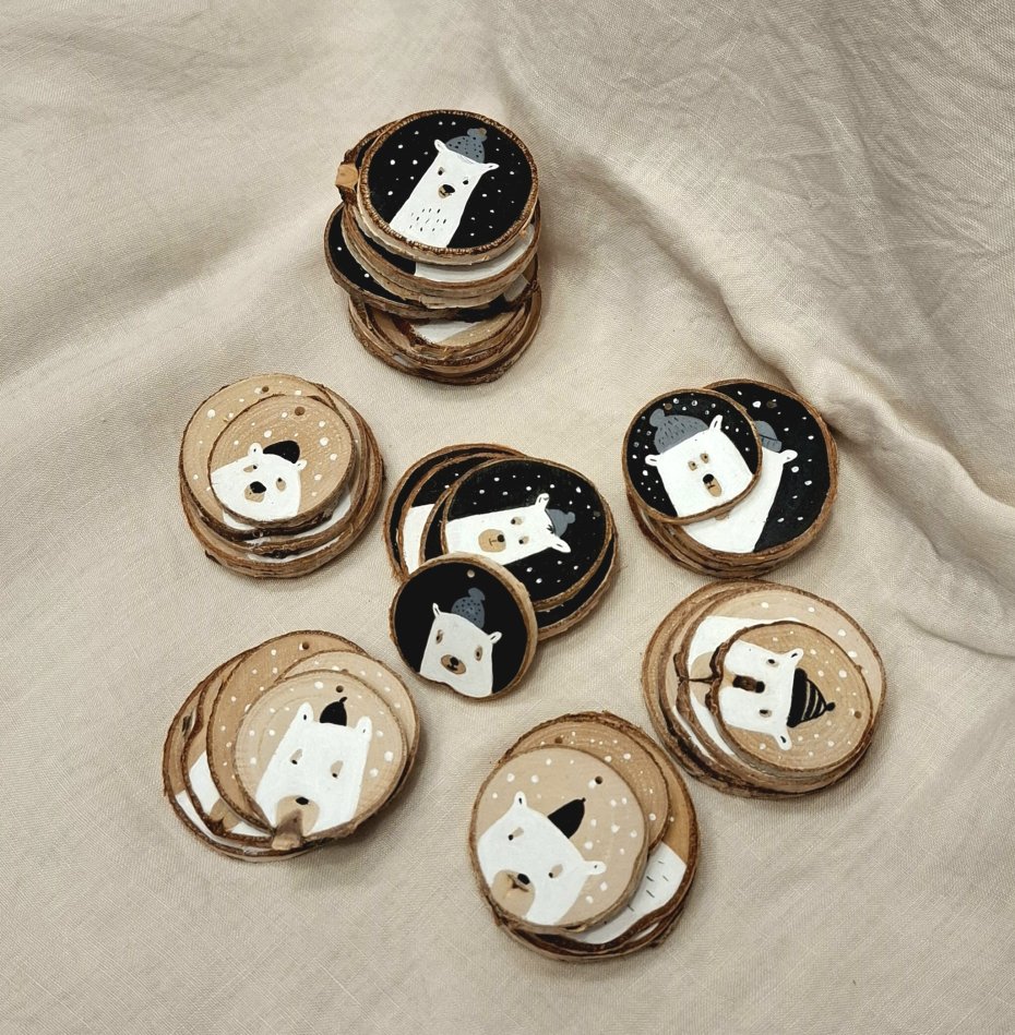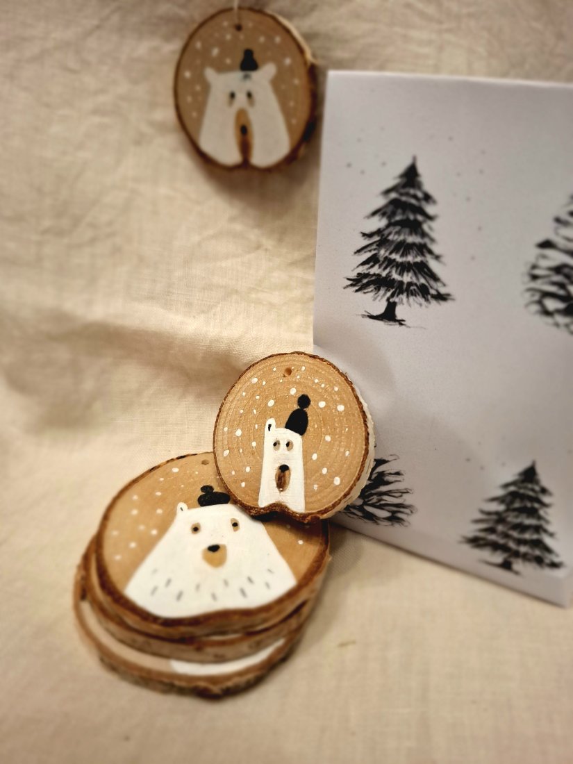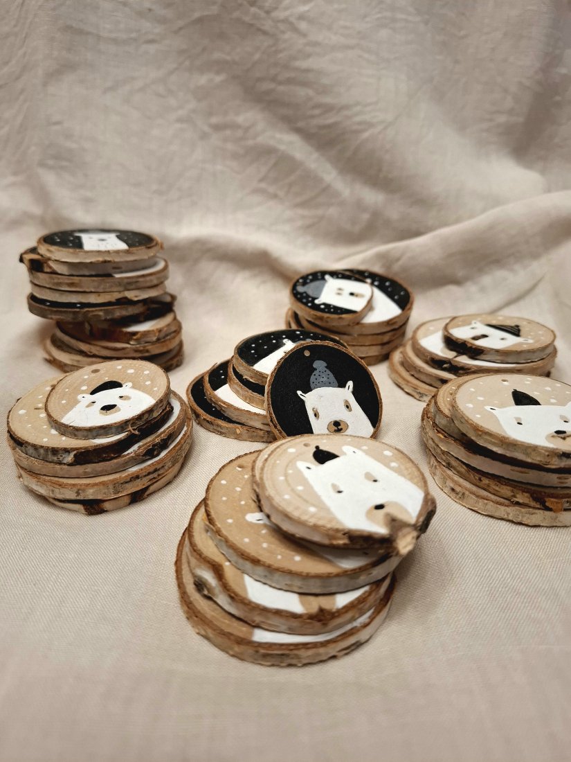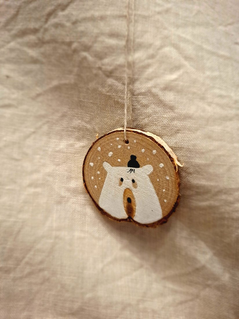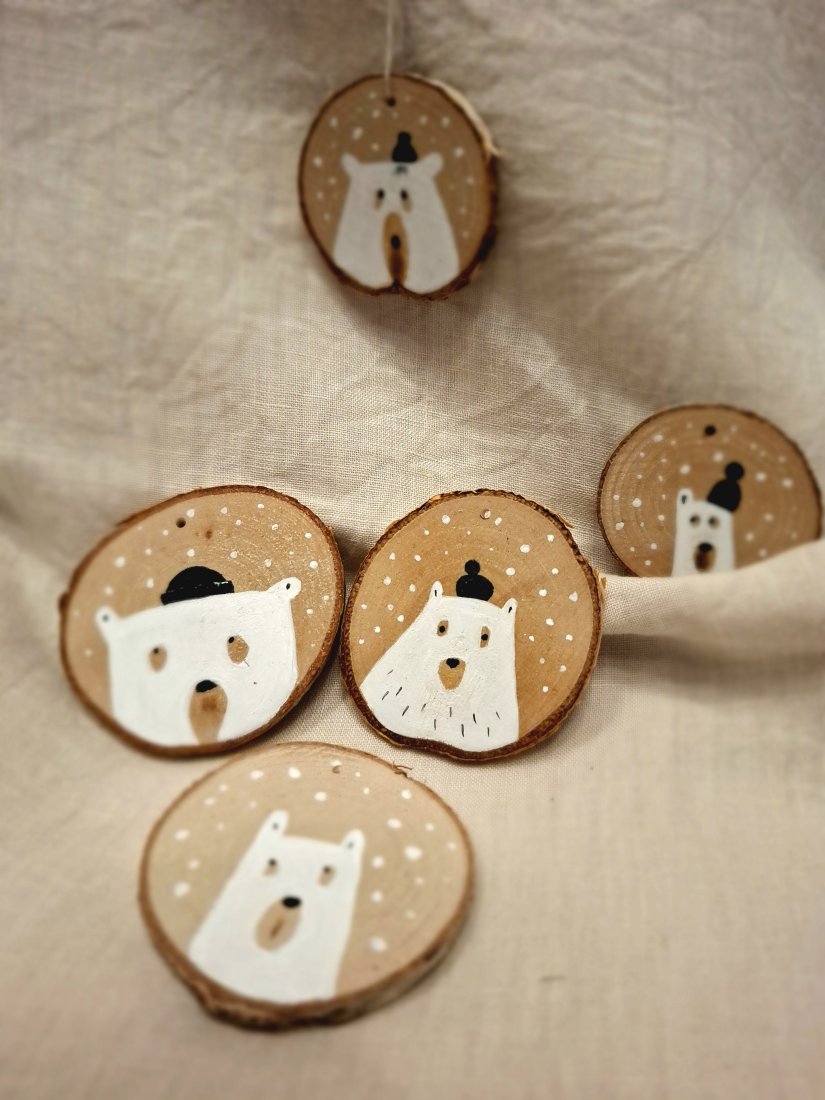 Drewniane zawieszki z motywem białego misia na JASNYM tle.