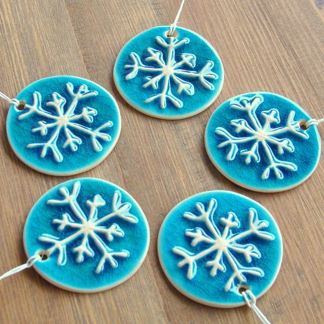 Zestaw 5 ceramicznych śnieżynek - zawieszek. Kolor turkusowy w delikatnie zielonym odcieniu. Przepiękna, stylowa ozdoba na choinkę albo stroik. Może być również ozdobą pięknie zapakowanego prezentu. Śnieżynki zapakowane w pudełko wyściełane siankiem drzewnym. Wymiary śnieżynek - ok. 4,5 cm. Polecam serdecznie.