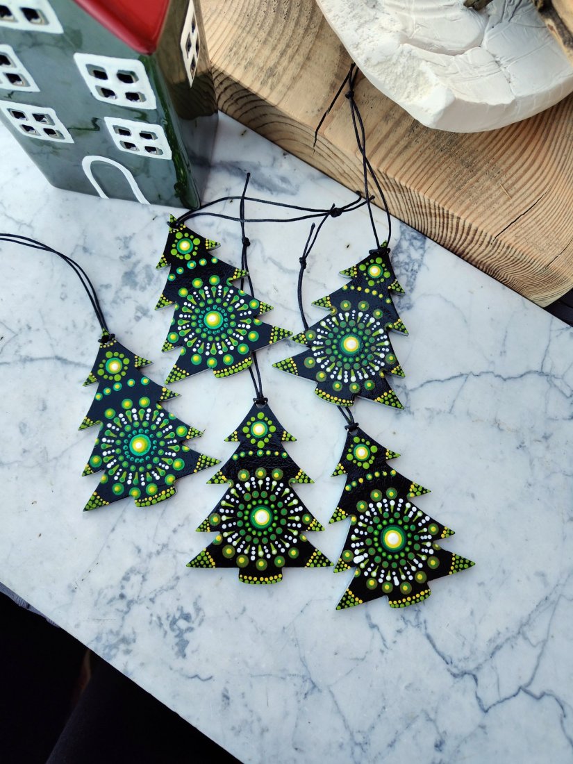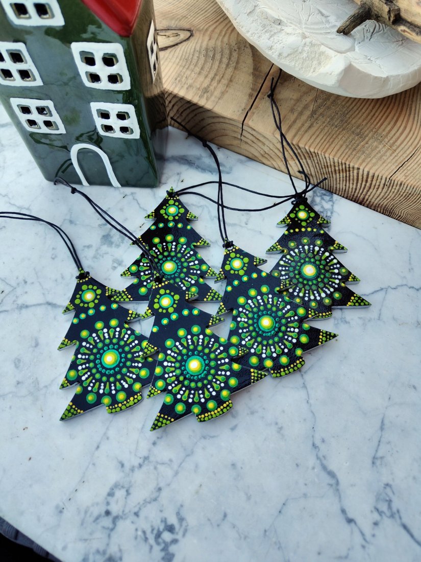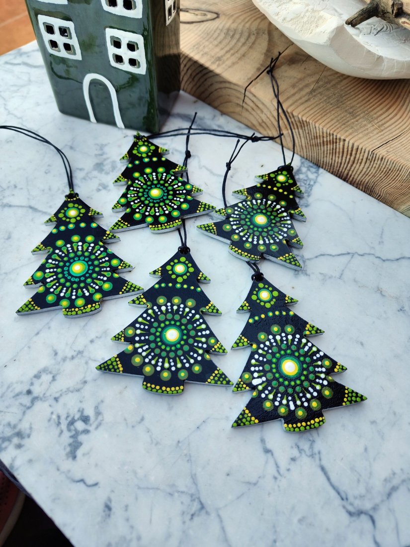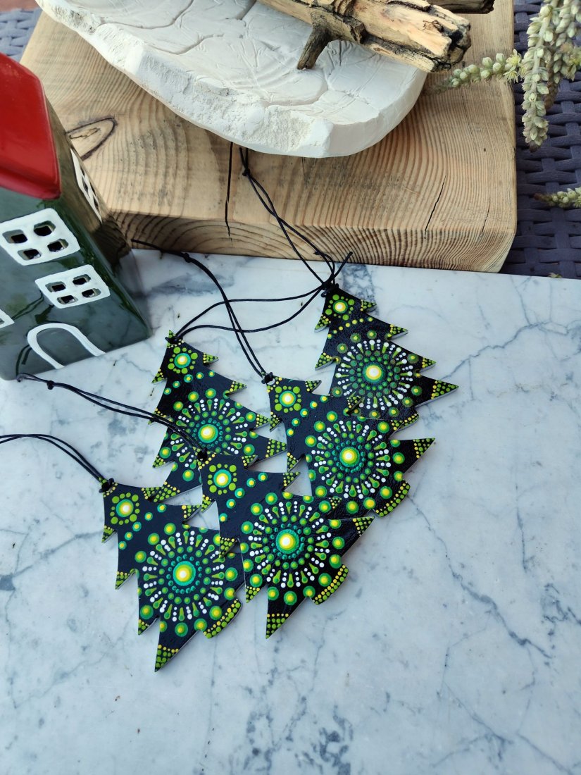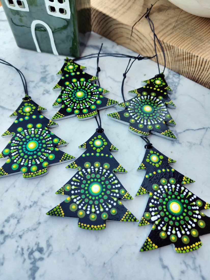 Ozdoby w kształcie choinek wykonane z solidnego materiału, ręcznie malowane techniką dot painting. Każda zawieszka wyróżnia się unikatowym wzorem mandali, który łączy głęboką czerń z intensywną zielenią i akcentami bieli oraz żółci. Idealne do dekoracji choinki, stroików, okien lub prezentów świątecznych. Dodadzą Twojemu wnętrzu oryginalnego, nowoczesnego, a jednocześnie świątecznego charakteru.