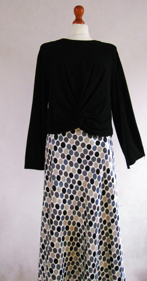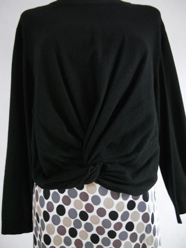 czarny, rękawy lekko rozszerzane u dołu, z przodu "zawirowanie" nadające ciekawy kształt.prosty a jednak coś innego.stan idealny.