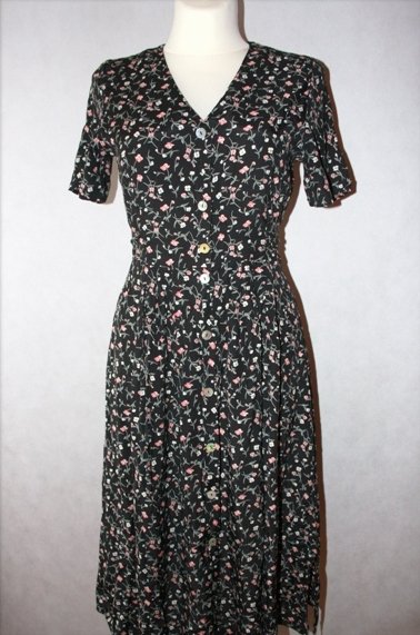 czarna cienka sukienka vintage w kwiaty, długość midi, zapinana z przodu na guziki, krótki rękawek, z tyłu wiązana, po bokach rozcięcia, odcinana w pasie