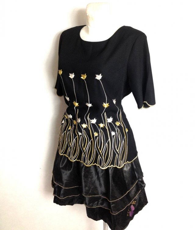 Rewelacyjna dłuższa czarna bluzka o fasonie rozkloszowanym, z przodu ze złoto srebrnymi haftami w postaci kwiatów, przy rękawie i na dole obszyta grubą złotą nicią- fajne falowe wykończenie.Bluzka z boku zasuwana na suwak.Tył gładki czarny.