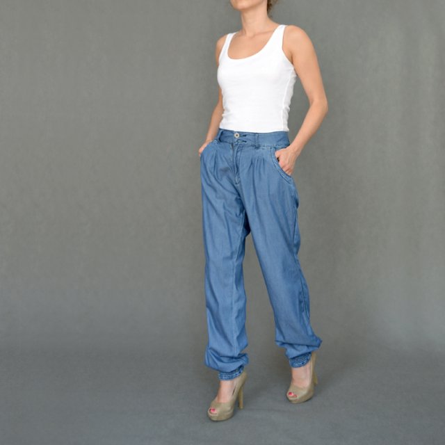 Świetne spodnie ze ściągaczami z cienkiego, lejącego dżinsu. Z tyłu wszyta niewielka gumka. Kolor troszkę mniej intensywny. Proszę sugerować się wymiarami bo są prezentowane na mniejszym rozmiarze, więc będą troszkę inaczej leżeć.