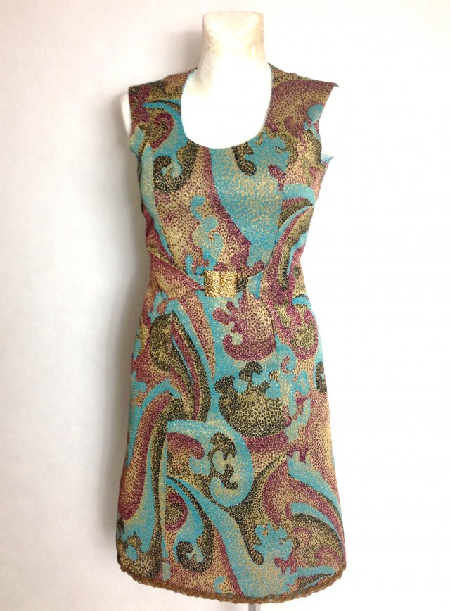 Unikatowa sukienka o delikatnie rozkloszowanym kroju, wykonana z mięsistej , delikatnie elastycznej ,trzymającej formy tkaniny, w pięknych kolorach : turkusowym, ciemnym malinowym i złotym, w ornamentowe wzory, z przodu zapinana na złotą klamrę, z tyłu zasuwana na suwak. Sukienka posiada podszewkę