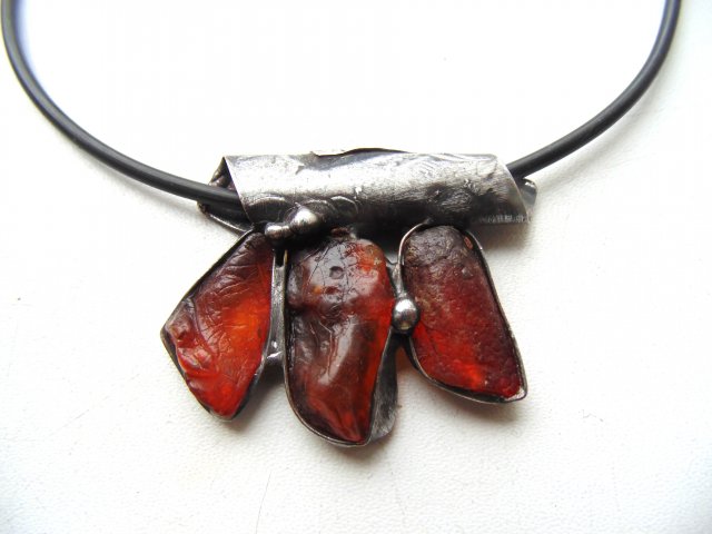Wisiorek wykonany techniką witrażowa z miedzi, cyny i surowych bursztynów. Zawieszony na czarnej lince kauczukowej o długości ok. 45 cm. Wymiary ok. 4 na 5 cm.