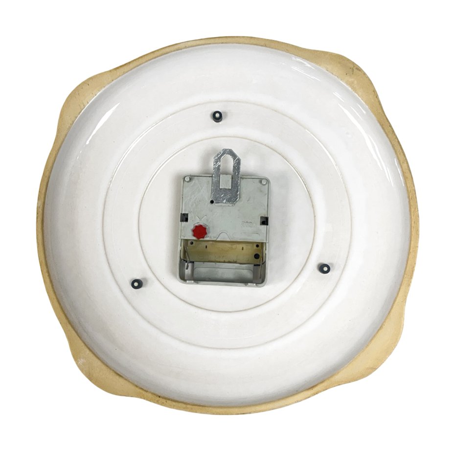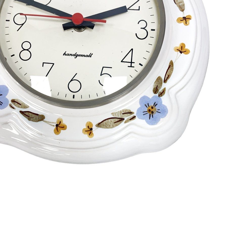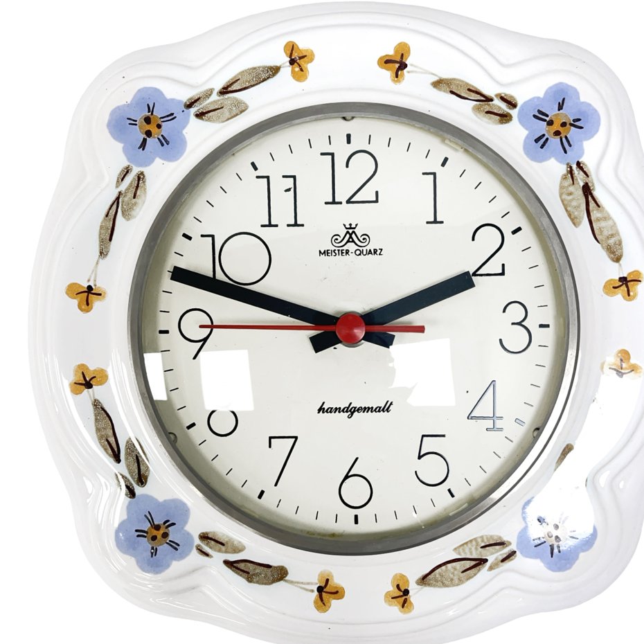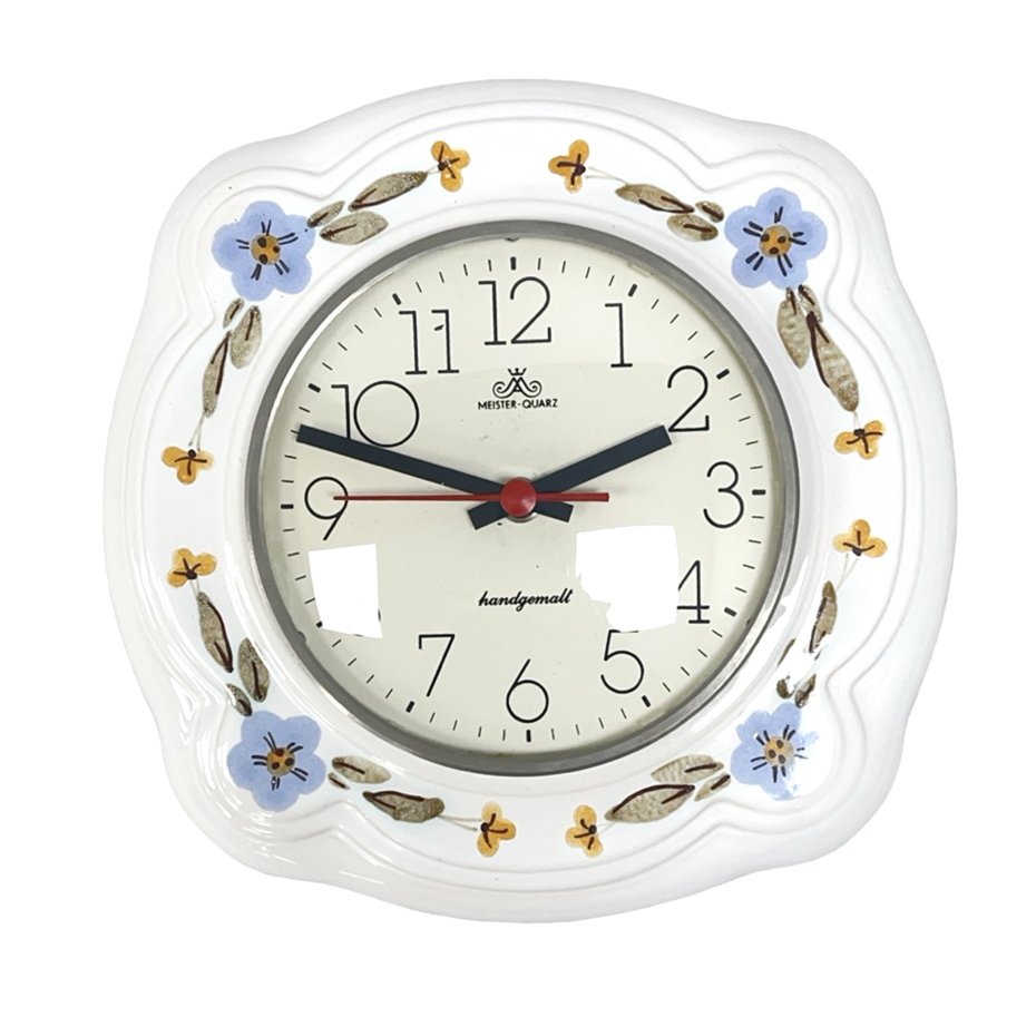 Zegar ścienny Meister-Quarz — ceramika biała ręcznie malowana (napis "handgemalt"), obudowa zdobiona niebieskimi kwiatami i złotymi motylkami, reliefowa faktura, tarcza biała z czarnymi cyframi arabskimi, wskazówki czarne i czerwona. Obudowa kwadratowa z zaokrąglonymi narożnikami i falistymi krawędziami, zdobiona ręcznie malowanymi kwiatami w kolorze niebieskim (niezapominajki), złotymi motylkami oraz brązowo-beżowymi listkami. Mechanizm kwarcowy. Meister-Quarz (w niektórych wersjach jako Meister-Anker) to niemiecki producent zegarów ceramicznych i ściennych, szczególnie aktywny w latach 60.–80. XX wieku, znany z charakterystycznych zegarów ceramicznych wytwarzanych w Niemczech. Wymiary: 26 × 26 × 5 cm. Niemcy, lata 70./80. XX w. Stan bardzo dobry, mechanizm sprawny.