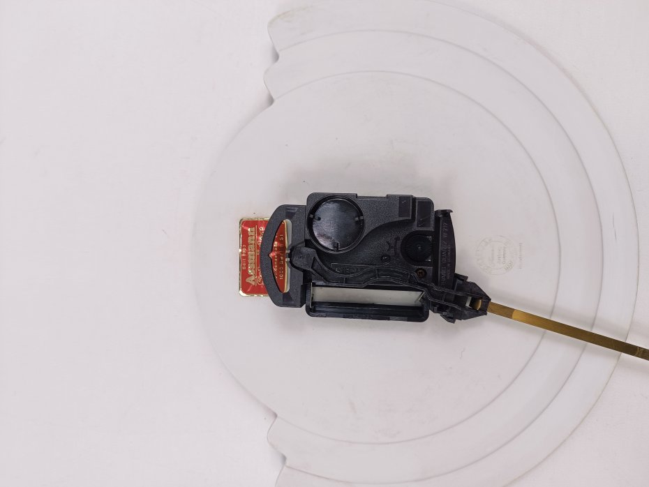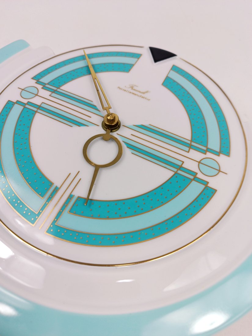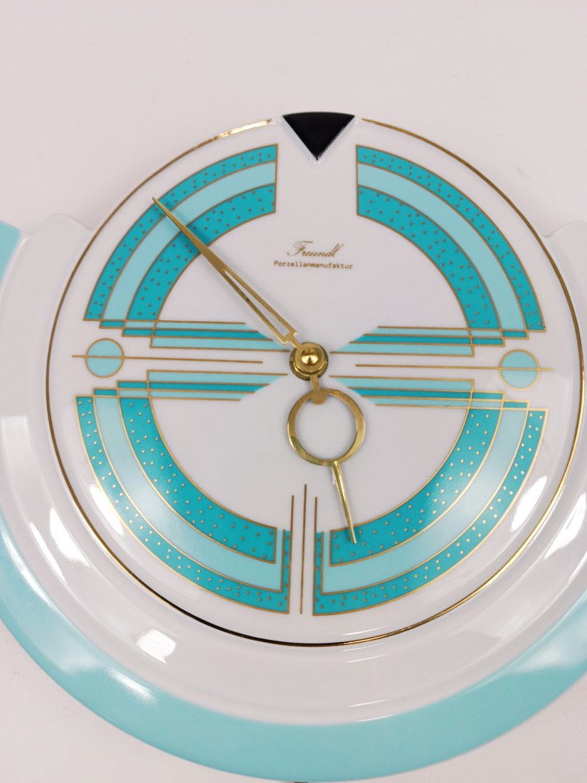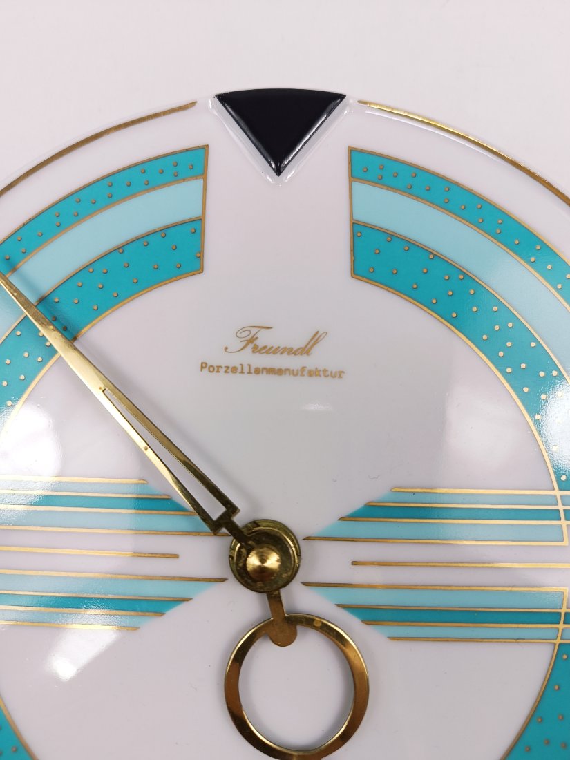 Wahadłowy zegar ścienny w stylu Art Deco, wykonany przez manufakturę porcelany Freundl. Jest to zegar kwarcowy, co oznacza, że jest zasilany baterią. Zegar zdobią złocenia oraz wzory geometryczne. Stan zachowania bardzo dobry. Wysokość 32,5 cm.