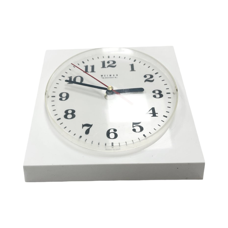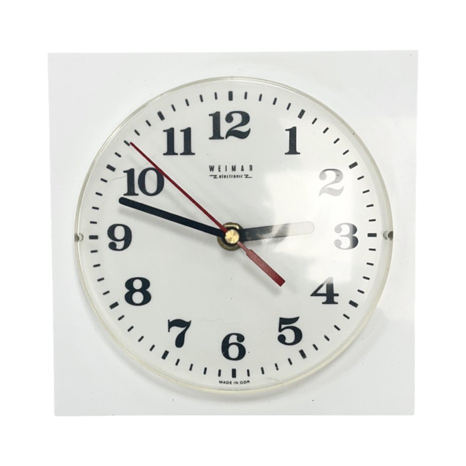 Wygląd: Zegar o minimalistycznej, kwadratowej formie z okrągłą tarczą. Biała, czytelna tarcza z wyraźnymi, dużymi cyframi arabskimi w kolorze czarnym oraz podziałką minutową. Poniżej cyfry 12 widoczny napis "WEIMAR electronic", na dole tarczy oznaczenie "MADE IN GDR". Złocony środek mechanizmu wskazówek dodaje eleganckiego akcentu. Prosta, funkcjonalna estetyka typowa dla wzornictwa użytkowego NRD.