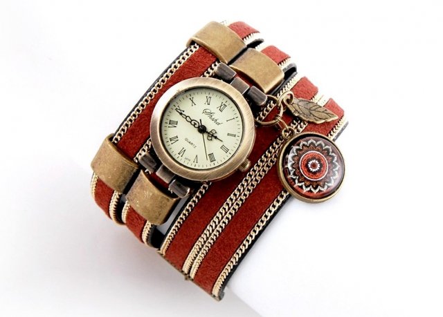 Ta efektowna biżuteria stanowi połączenie bransoletki oraz zegarka. Zegarek posiada działający mechanizm z wymiennymi bateriami.