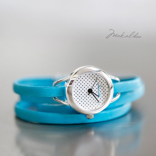 Śliczny, delikatny, kobiecy, zegarek. Mój autorski projekt ma tarczę wielkości 18 mm średnica zegarka 23 mm. Pasek szeroki na 5 mm owija nadgarstek 4 razy. Pasuje na nadgarstek 14 - 16cm. Baza w kolorze srebrnym. Jeśli potrzebujesz inny rozmiar napisz. Zegarek posiada mechanizm kwarcowy i wymienną baterię. Wolny od niklu i ołowiu. Projekt autorski. Wszystkie prawa zastrzeżone.
