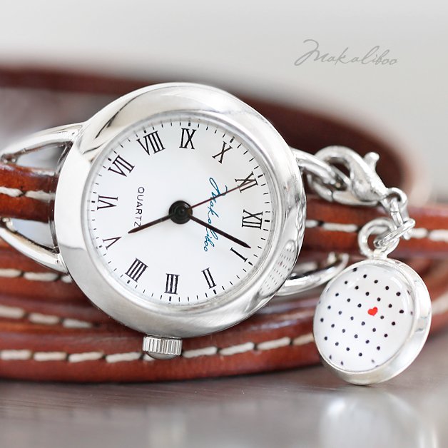 Śliczny, delikatny, kobiecy, zegarek. Mój autorski projekt ma tarczę wielkości 18 mm średnica zegarka 23 mm. Baza w kolorze srebrnym. Odpinany cherms z autorską grafiką ma średnicę 12 mm. Pasek szeroki na 5 mm owija nadgarstek 4 razy. Pasuje na nadgarstek 14 - 16cm. Jeśli potrzebujesz inny rozmiar napisz. Zegarek posiada mechanizm kwarcowy i wymienną baterię. Wolny od niklu i ołowiu. Projekt autorski. Wszystkie prawa zastrzeżone