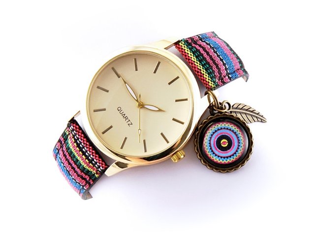 Pasek wykonany jest z wzorzystej tkaniny w stylu folkowym, pod spodem usztywniony skórą ekologiczną, zapinany na klamrę. Pasuje na nadgarstek od 15 do 19,5 cm w obwodzie.