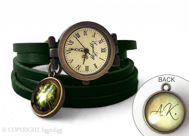 Autorski zegarek marki EgginEgg ze skórzanym paskiem, trzykrotnie zakręcany na ręku z ręcznie robioną dwustronną zawieszką (kaboszonem). Zegarek został wyposażony w wysokiej jakości japoński mechanizm.