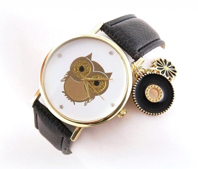 Stylowy zegarek z kopertą o wymiarach 38 mm, w oprawie w kolorze złotym. Ciekawa jest tarcza zegarka ozdobiona obrazkiem sowy w kolorze złotym.