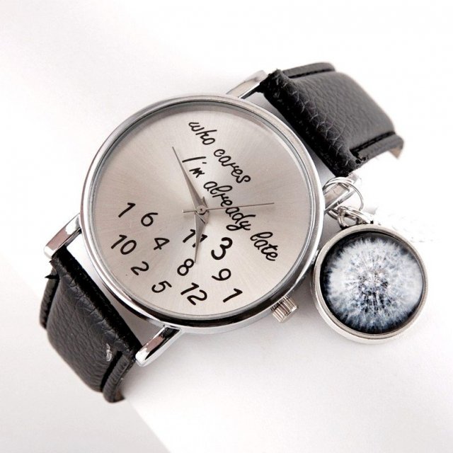Oryginalny, stylowy zegarek z dużą tarczą o średnicy 35 mm. Z napisem" Who cares. I'm already late" i ciekawymi zawieszkami ( dmuchawiec i mały listek)