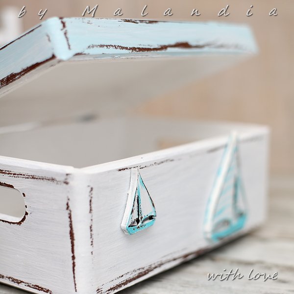 Zamykana drewniana skrzynka pomalowana metodą shabby chic, ozdobiona żaglówkami. Można w niej ukryć wiele drobiazgów, zdjęć.