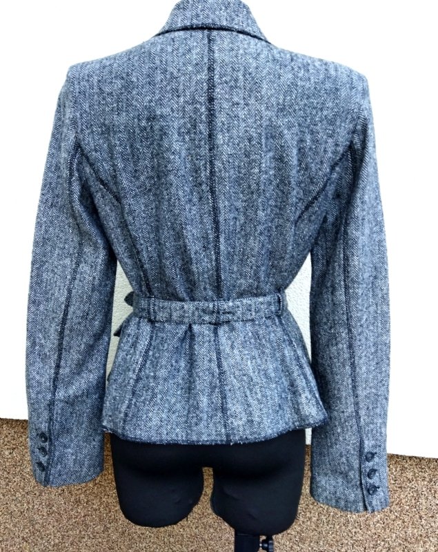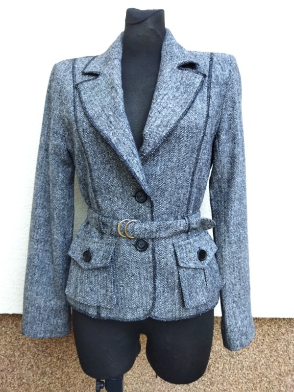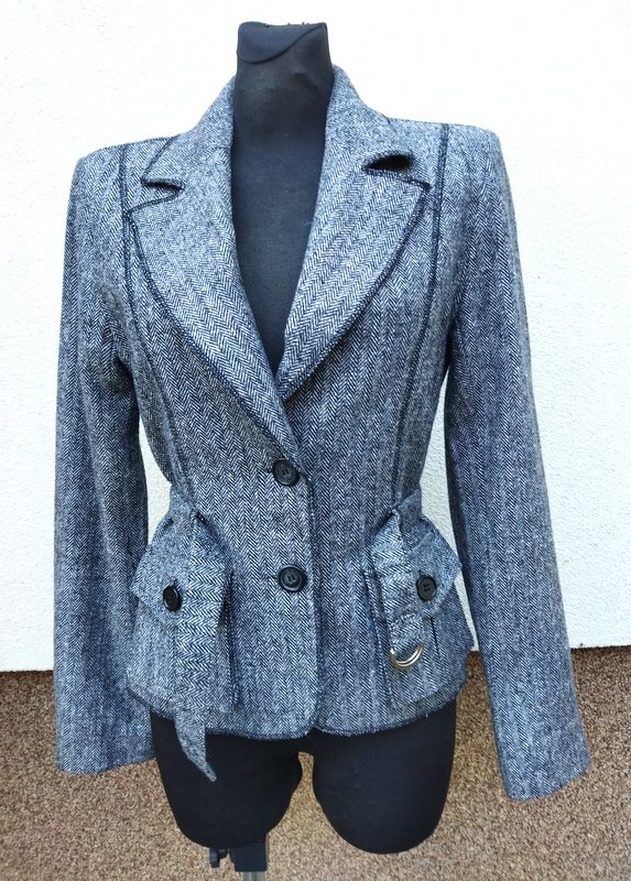 Zgrabna marynarka z wzorem w jodełkę w czarno-białej kolorystyce stębnowana czarną nicią. Taliowana, z kołnierzem z rewersami , z dwiema naszywanymi kieszeniami, z paskiem w talii z klamerkami. zapinana na dwa guziki, trzy mniejsze na mankietach rękawów. całość na podszewce;