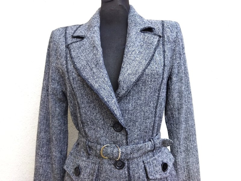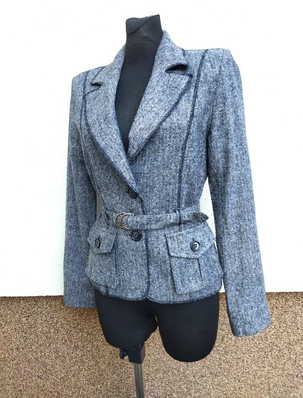Zgrabna marynarka z wzorem w jodełkę w czarno-białej kolorystyce stębnowana czarną nicią. Taliowana, z kołnierzem z rewersami , z dwiema naszywanymi kieszeniami, z paskiem w talii z klamerkami. zapinana na dwa guziki, trzy mniejsze na mankietach rękawów. całość na podszewce;