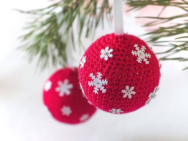 Bombki mają średnicę ok 6cm, zrobione są na szydełku z bawełnianej włóczki.