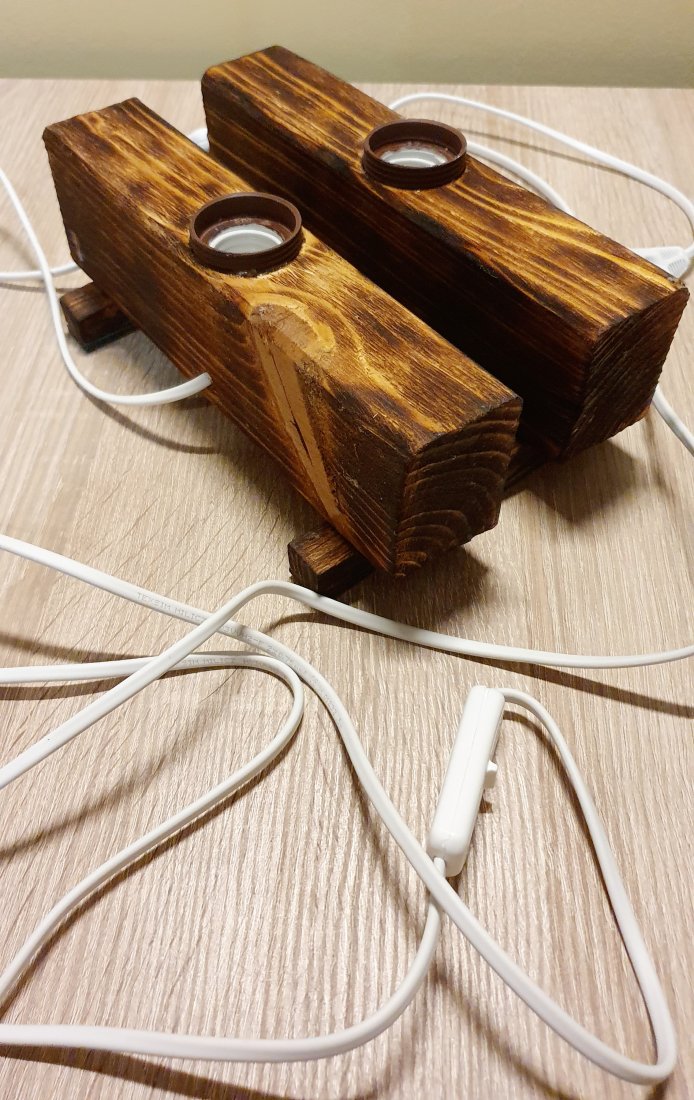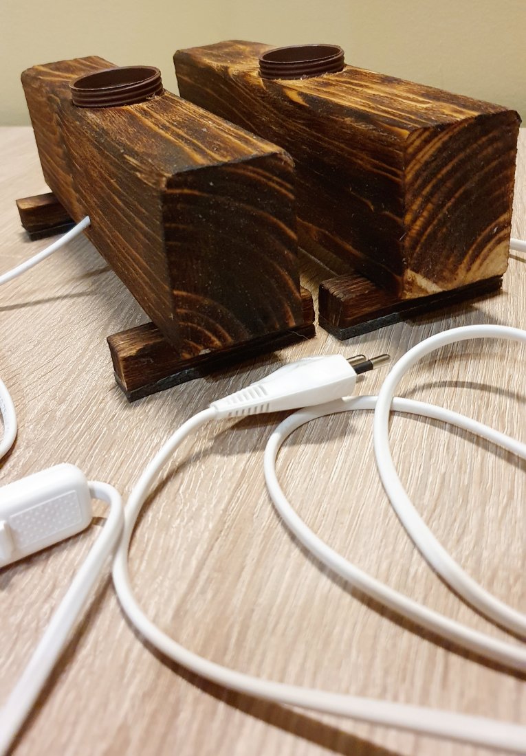 Wspaniałe lampki wykonane ręcznie z opalanego drewna. Lampki z powodzeniem mogą pełnić funkcję zarówno lamp stołowych, jak i lamp nocnych.