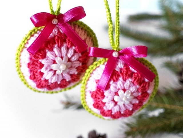 Bombki mają średnicę 6,5cm, zrobione są na szydełku z bawełnianej włóczki.
