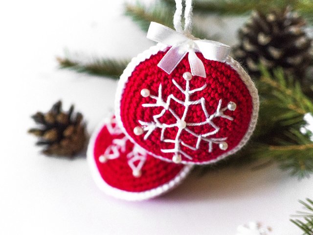 Bombki mają średnicę 6,5cm, zrobione są na szydełku z bawełnianej włóczki.