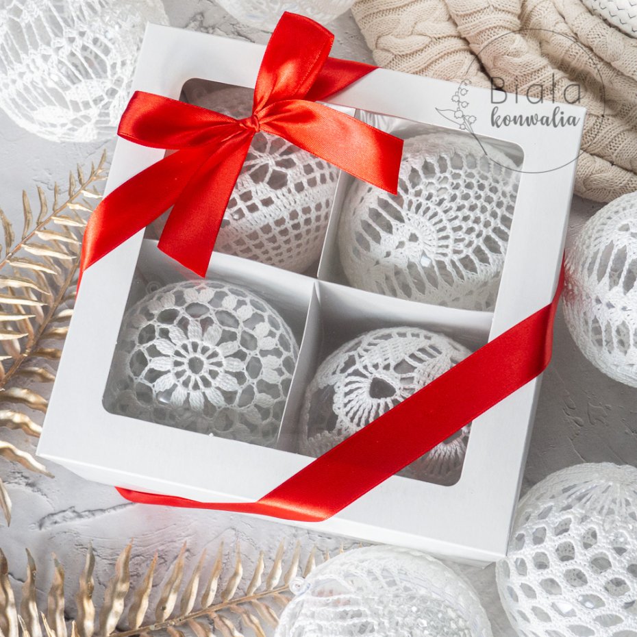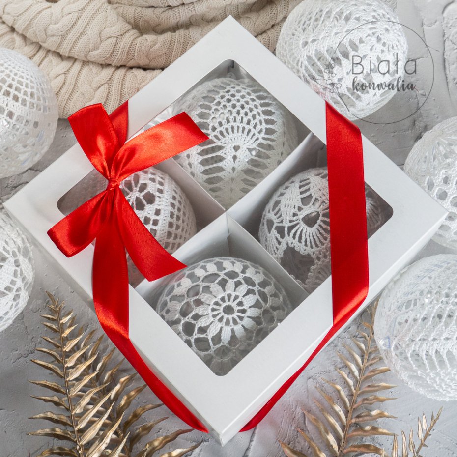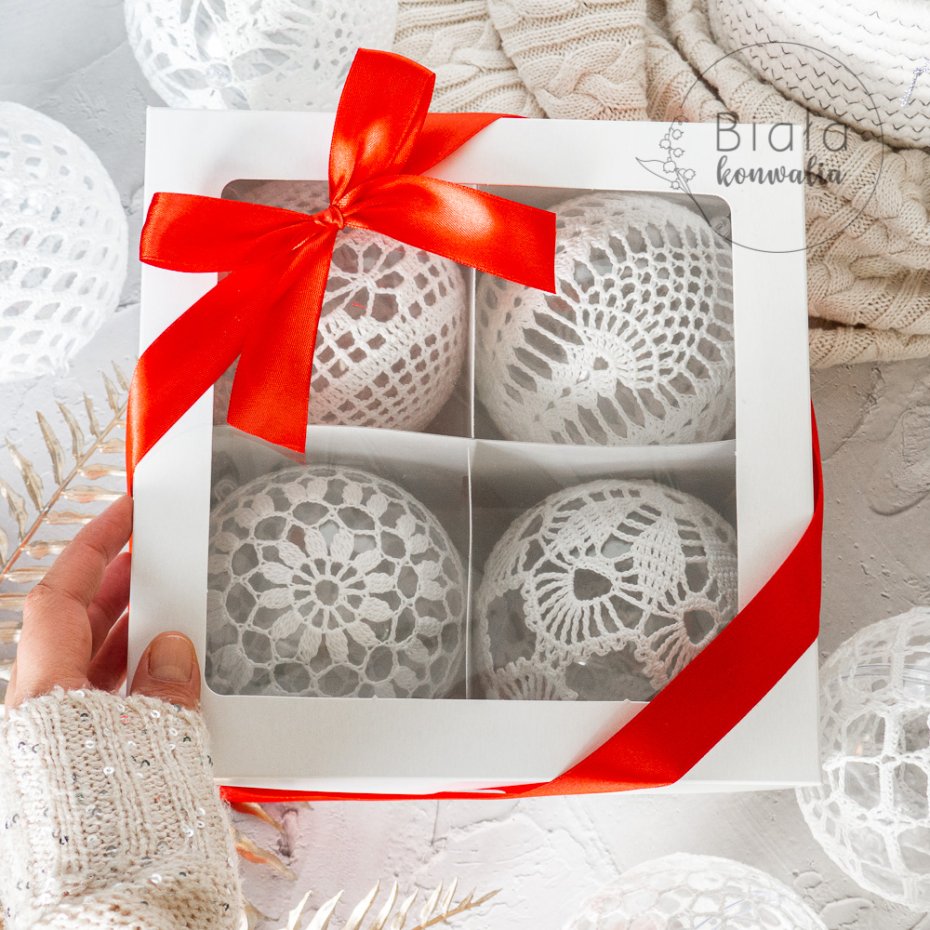 Zestaw 4 szydełkowych bombek, wykonanych ręcznie na bazie akrylowej kuli, dzięki czemu bombki są trwałe, nie odkształcają się, a na choince prezentują się cudownie. Zestaw składa się z 4 bombek, każda w innym, wyjątkowym wzorze. Zestaw jest elegancko zapakowany, gotowy do wręczenia na prezent. Bombki maja średnicę 10cm, są gotowe i dostępne od ręki.
