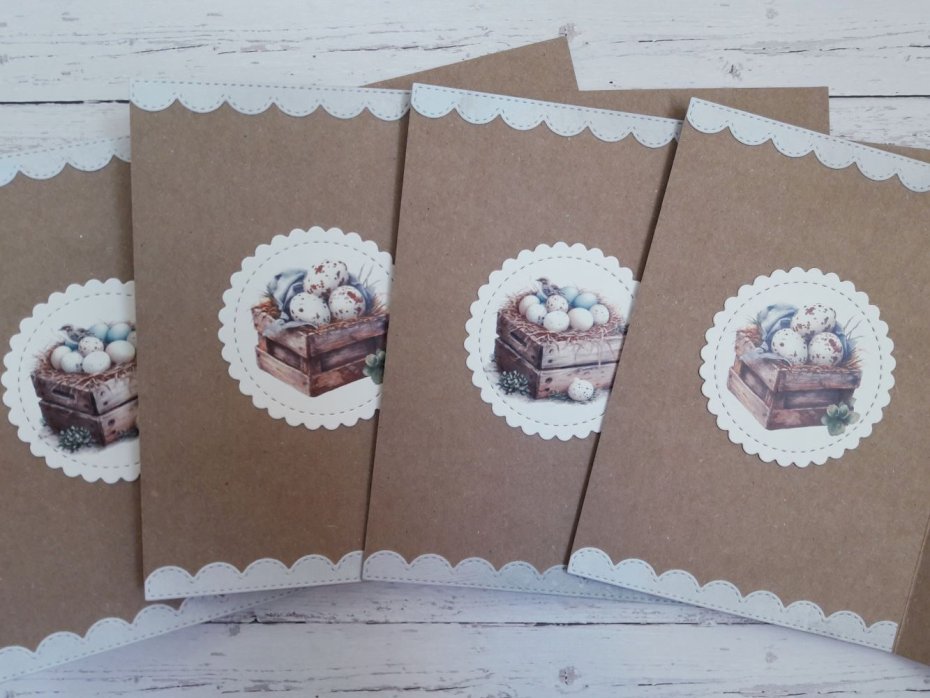 Zestaw 4 kartek wielkanocnych wykonanych metodą scrapbbokingu z wykorzystaniem profesjonalnych materiałów i z dbałością o każdy szczegół.