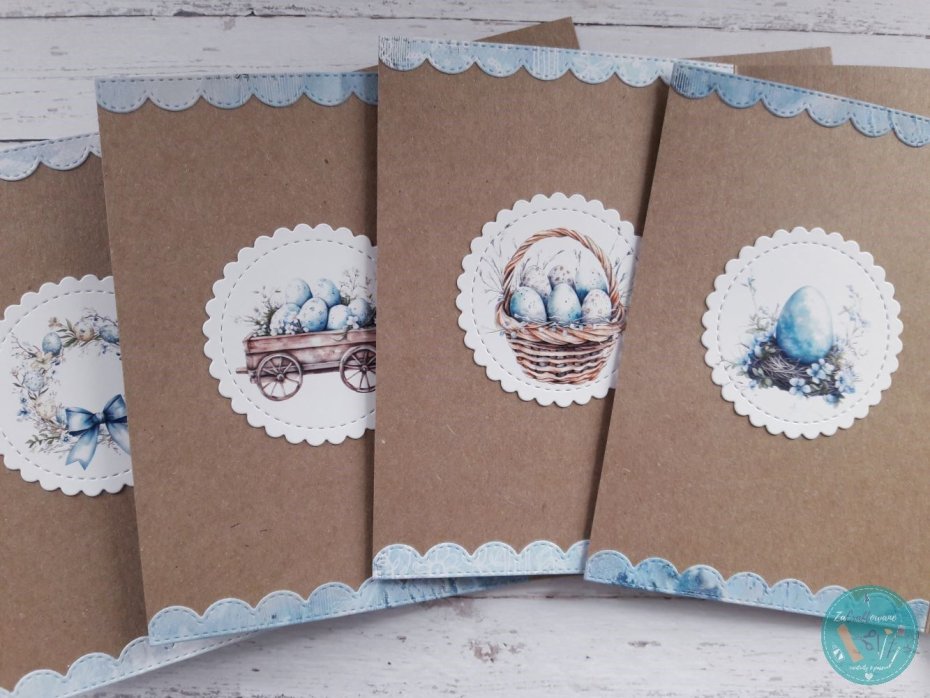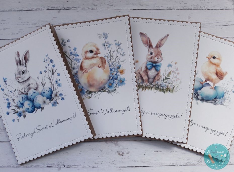 Zestaw 4 kartek wielkanocnych wykonanych metodą scrapbbokingu z wykorzystaniem profesjonalnych materiałów i z dbałością o każdy szczegół.