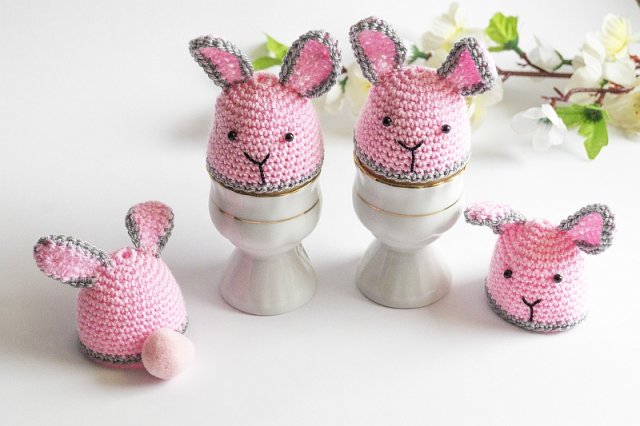 Zestaw 4 ocieplaczy na jajka wykonanych na szydełku, z miękkiej bawełnianej włóczki.