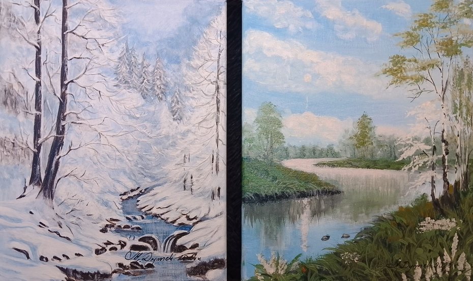 Harmonia natury w dwóch różnych odsłonach. Zestaw dwóch ręcznie malowanych obrazów na płótnie, które ukazują piękno polskiego krajobrazu w kontrastujących porach roku. Zestawienie mroźnego, ośnieżonego potoku z sielankowym, letnim widokiem tworzy fascynującą opowieść na ścianie. To idealna propozycja dla osób, które kochają zmienność natury i szukają sztuki z duszą. Wprowadź magię pór roku do swojego domu.