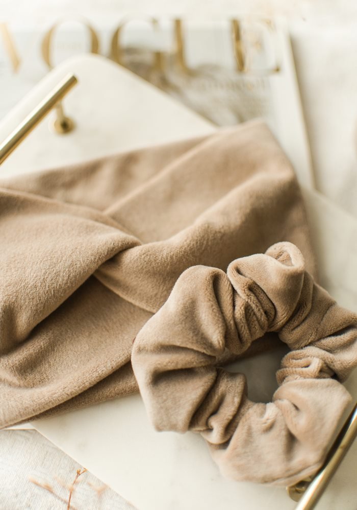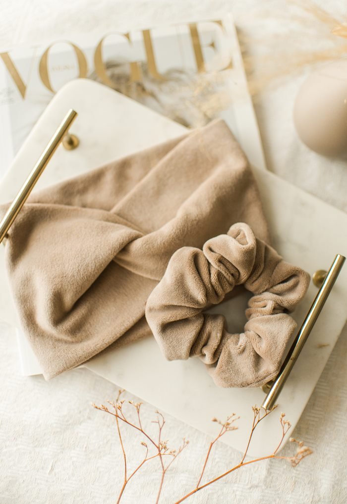 Zestaw opaska i gumka w kolorze beżowym z welurowego materiału. Miłe w dotyku.
