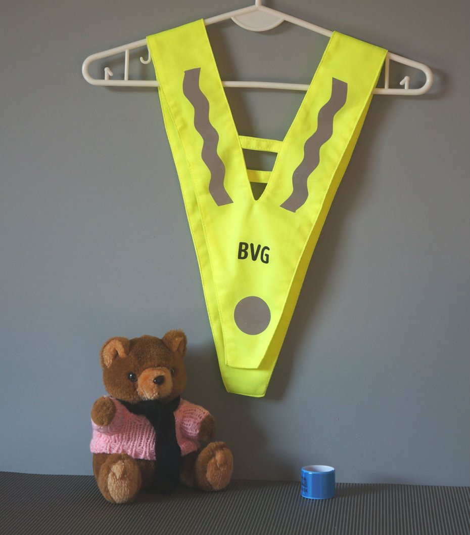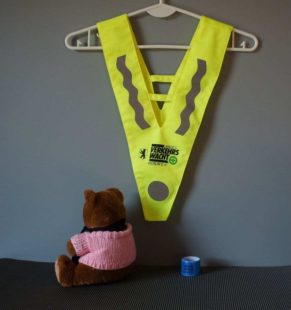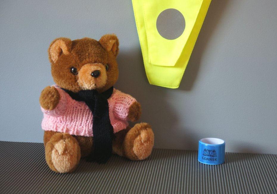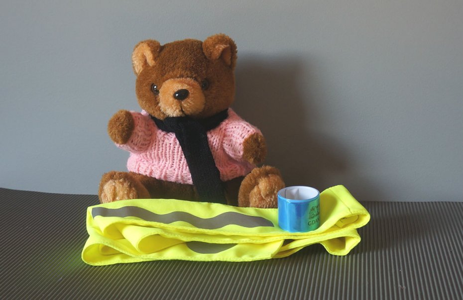 Zestaw składa się z siedzącego misia /wysokość 19 cm/, kamizelki-szelki z elementami odblaskowymi i opaski na rękę.