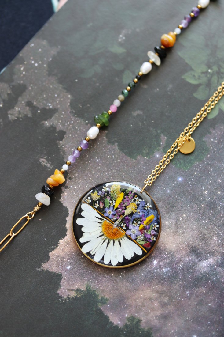 Ręcznie tworzę biżuterię z żywicy epoksydowej z zatopionymi, starannie wyselekcjonowanymi kwiatami. W projektach wykorzystuję także naturalne kamienie, tworząc wyjątkowe zestawy łączące delikatność roślin z energią minerałów.