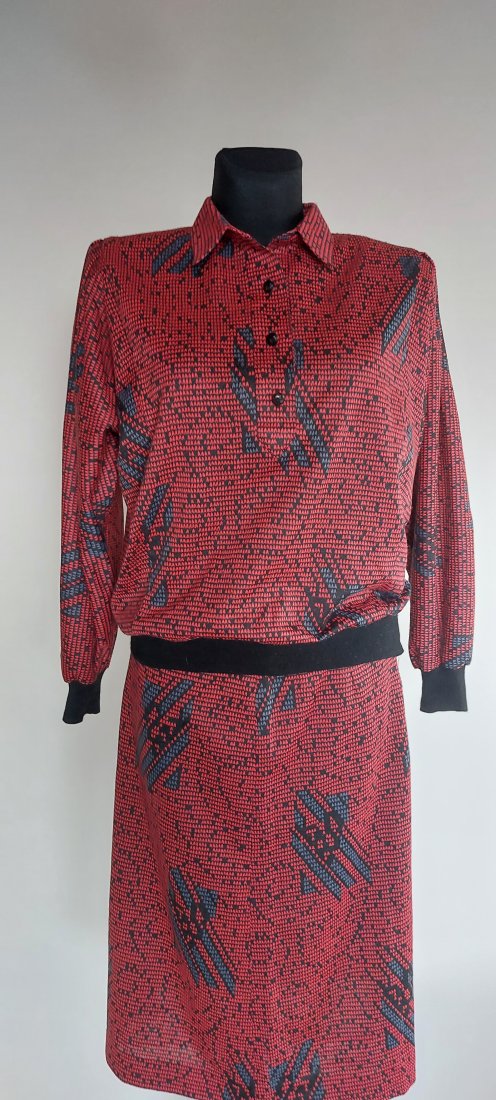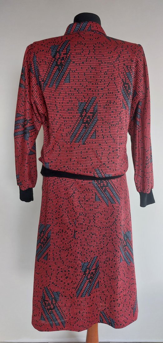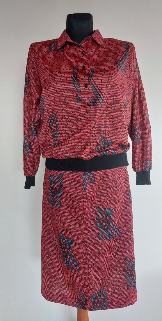 Komplet z lat 80-tych zachowany w bardzo dobrym stanie( maleńkie zaciągnięcia), wykonany z materiału z niewielką domieszką cienkiej wełny (6%).