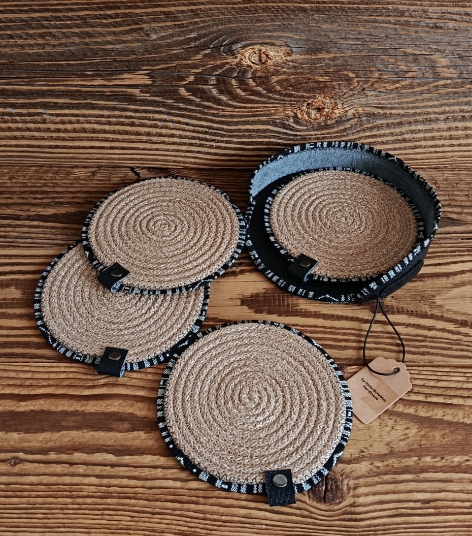 Zestaw 4 podkładek pod kubki w stylu boho by Hady-Surowiec to połączenie naturalnych materiałów i ręcznego rzemiosła, które wnosi do wnętrza ciepło i wyjątkowy klimat. Każda podkładka została starannie wykonana z wysokiej jakości bawełnianego sznurka oraz wykończona elementem ze skóry naturalnej, co nadaje jej elegancki, a zarazem przytulny charakter.