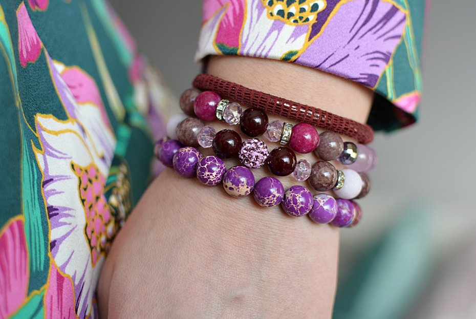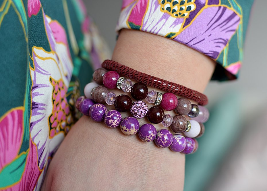 - bransoletki z kul jadeitu (śr. 10mm), kryształków szklanych, a także z przekładek z cyrkoniami nanizanych na mocną silikonową gumkę;