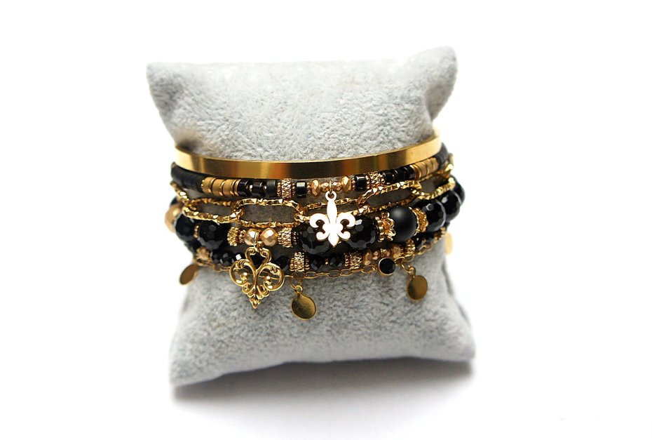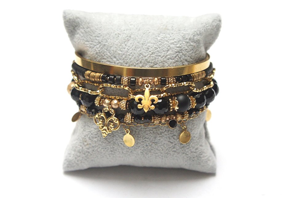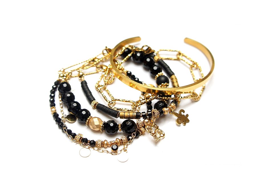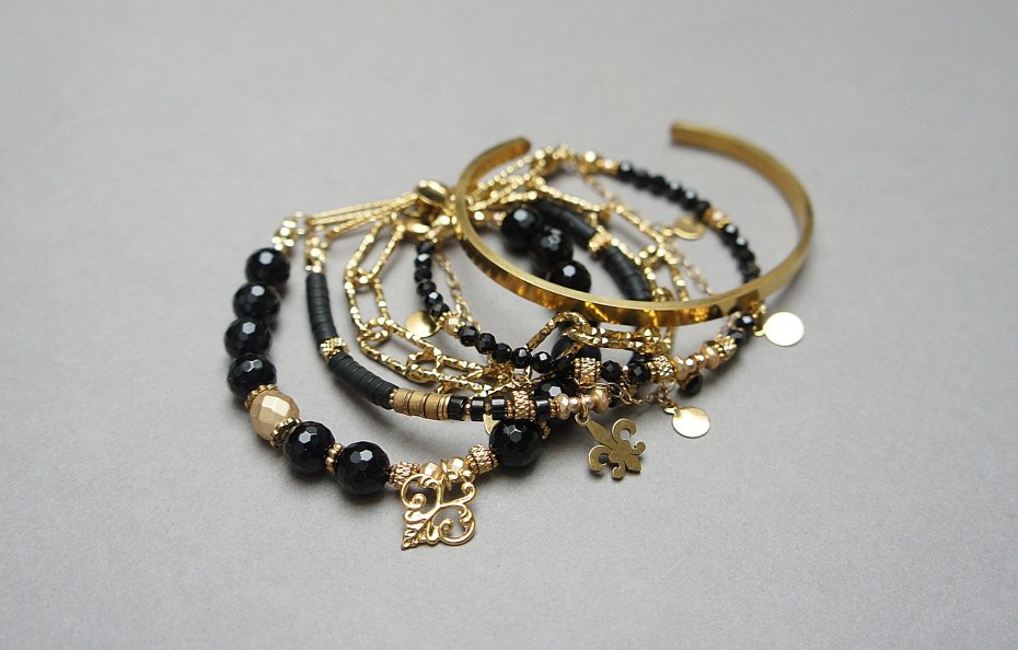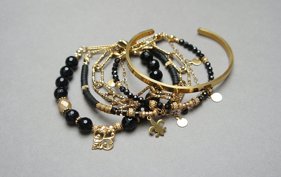 Zestaw pięciu bransoletek wykonanych w całości z pozłacanej stali szlachetnej oraz naturalnych, półszlachetnych kamieni - onyks fasetowany [4mm i 6mm], talarki czarnego, matowego hematytu [4 x 2mm], talarki złotego, matowego hematytu [4 x 2mm], hematyt fasetowany, platerowany [8mm, 4mm i 2mm], przekładek z hematytu [1mm] oraz zawieszki z cyrkonią w okuciu Bransoletki pasują na nadgarstek 15 - 16cm Biżuteria ozdobnie zapakowana.