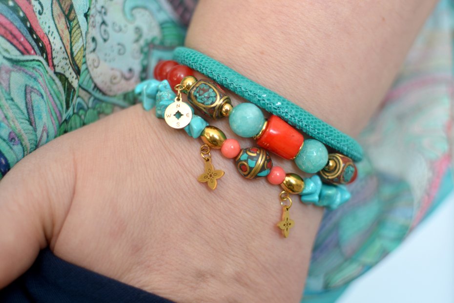 - bransoletki na gumce z kul jadeitów (śr. 10mm i 8mm), walca korala robaczywka, a także ręcznie wykonanych koralików tybetańskich z koralem i turkusem w oprawie z mosiądzu. Bransoletka została przyozdobiona zawieszką ze stali szlachetnej w kolorze złotym;
