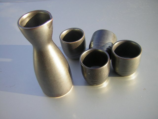 Zestaw ceramiczny. Karafka - wazonik i cztery Czarki - kieliszki. Prosta graficzna forma i ciekawe szkliwienie. Grafitowy kolor z lekkim srebrnym połyskiem w świetle. Wykończenie satynowo - matowe, gładkie. Bardzo przyjemne w dotyku, jakby jedwabiste. Karafka - wazonik...z dziubkiem. Pękatość trochę ponad 5 cm dół ciut poniżej 5 góra 4 x ponad 4 cm wys. 13 Czarki - kieliszki z delikatnym ryflowanie od dołu -góra 4,5 dół nie pełne 3,5 wys. Nie całe 5 cm