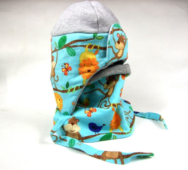 Ciepły zestaw czapka i komin wykonany z bardzo grubej dzianiny dresowej w kolorze szarym i 100% bawełny w małpki. Komin zapinany na zatrzaski, można go nosić na dwa sposoby. Wymiary komina: 53 cm x 20 cm. Czapka pasuje na głowę o obwodzie 50/52 cm.