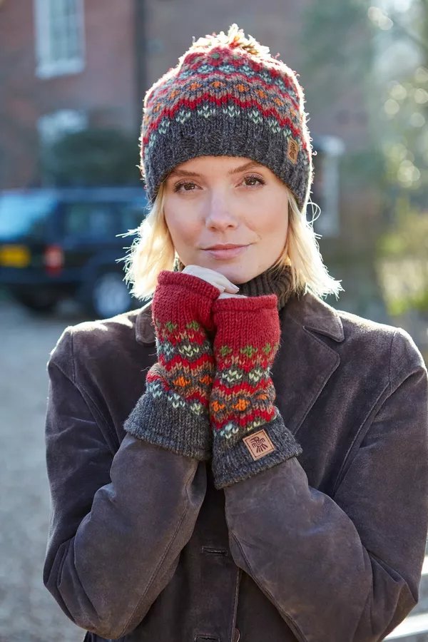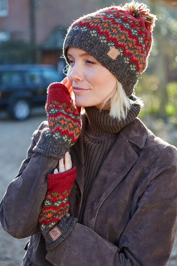 Nasz komplet - czapka i ocieplacze na dłonie wykonany jest ze 100% nowozelandzkiej wełny owczej w kolorze bordowym. Czapka typu beanie z pomponem jest częściowo podszyta opaską polarową wokół głowy i uszu, a ocieplacze na dłonie są w całości wyłożone polarem, dzięki czemu wszystko jest piękne i ciepłe, gdy jesteś poza domem.
