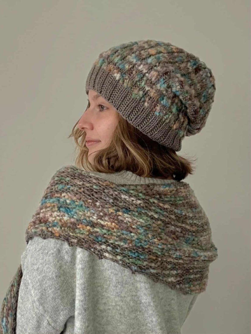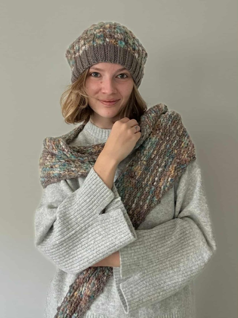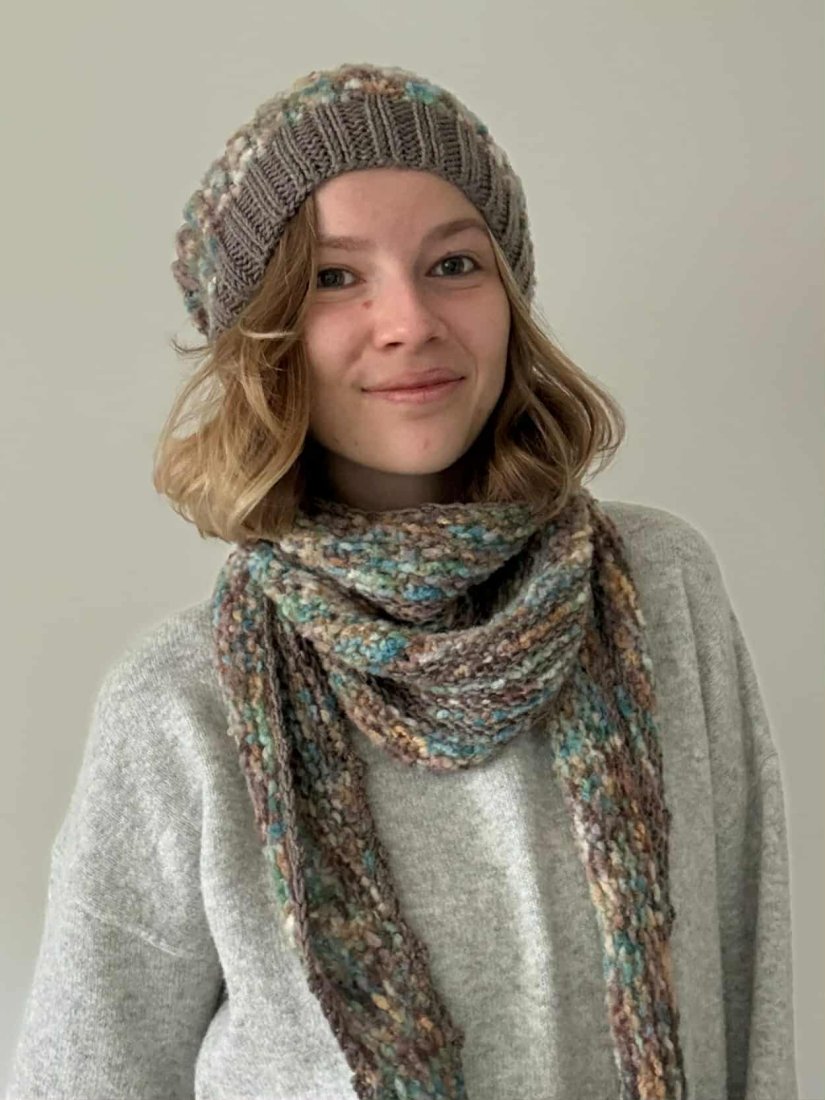 Efektowny zestaw w skład którego wchodzi szal i czapka. Całość ręcznie wykonana na drutach wysokiej jakości włóczki będącej połączeniem wełny z merynosa 80 % i poliamidu /20 %, miękki ciepły, lekki i elegancki - doskonały wybór na chłodne dni..