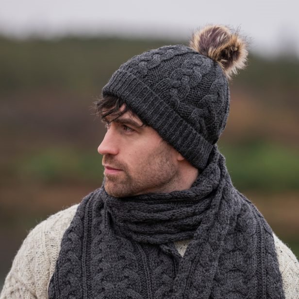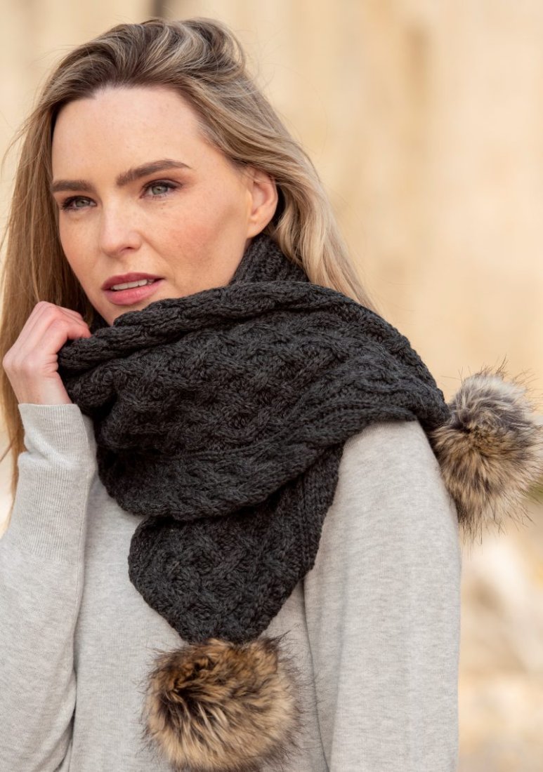 Ten piękny szalik, zaprojektowany na wzór irlandzkiej dzianiny Cable, ma futrzane pompony na obu końcach.