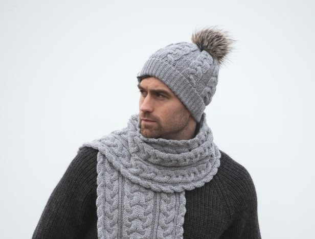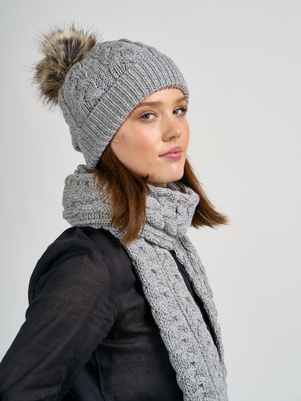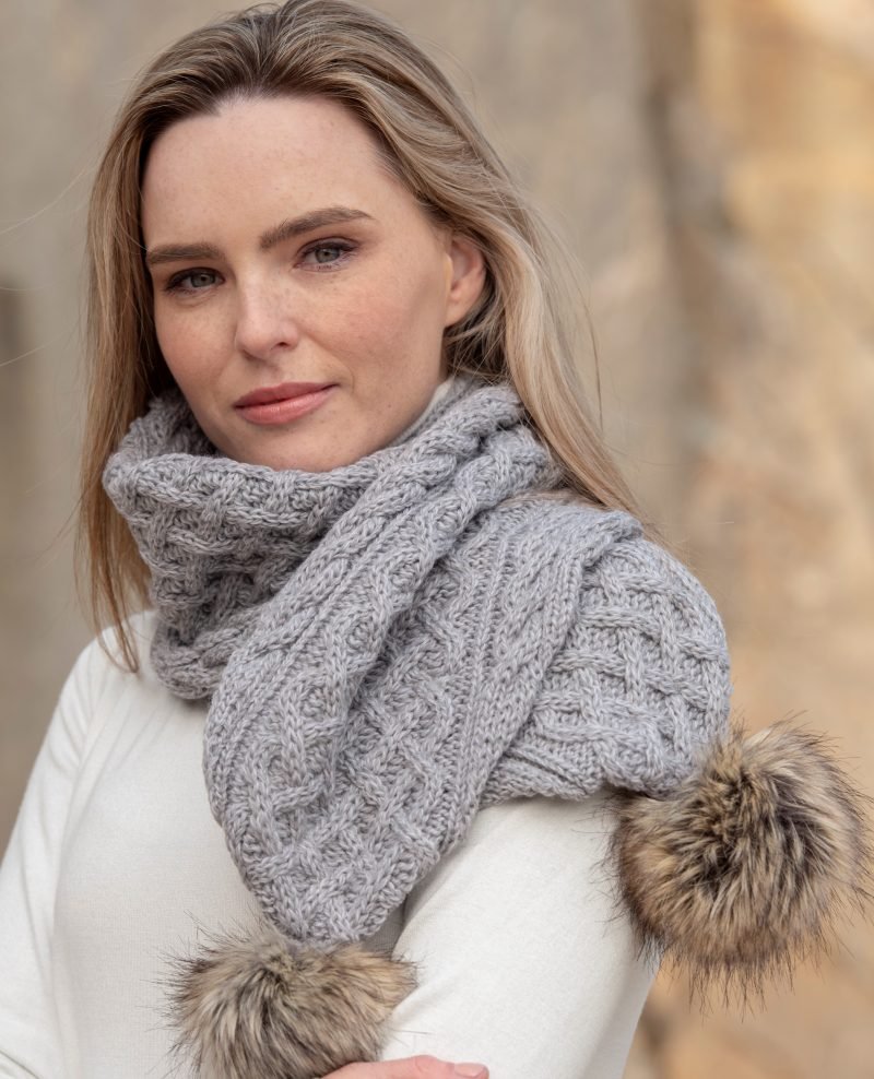 Ten piękny szalik, zaprojektowany na wzór irlandzkiej dzianiny Cable, ma futrzane pompony na obu końcach.