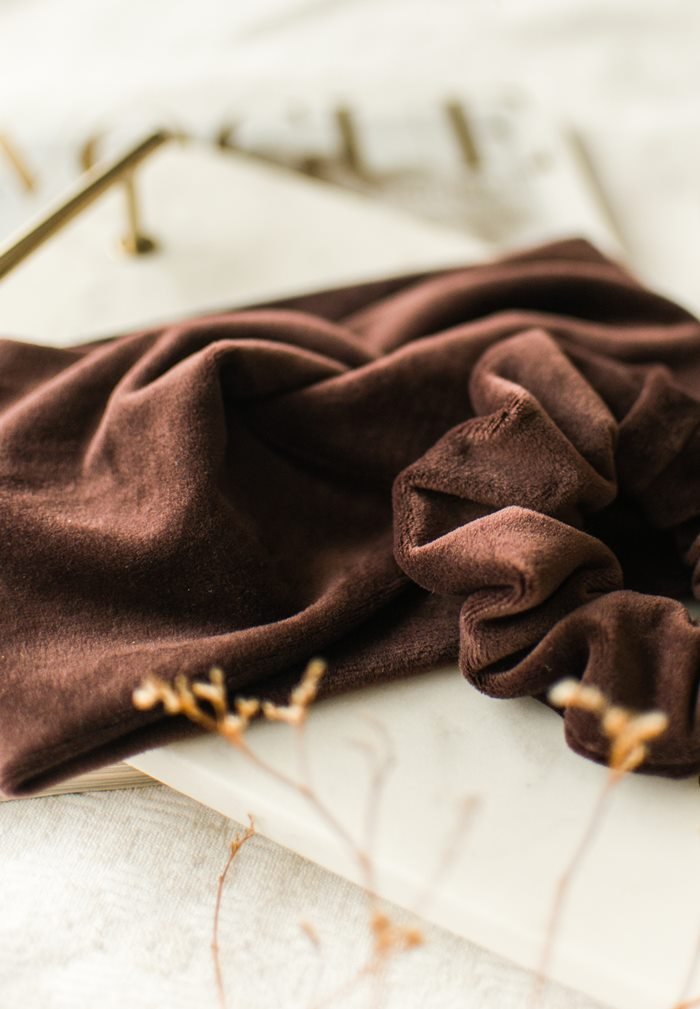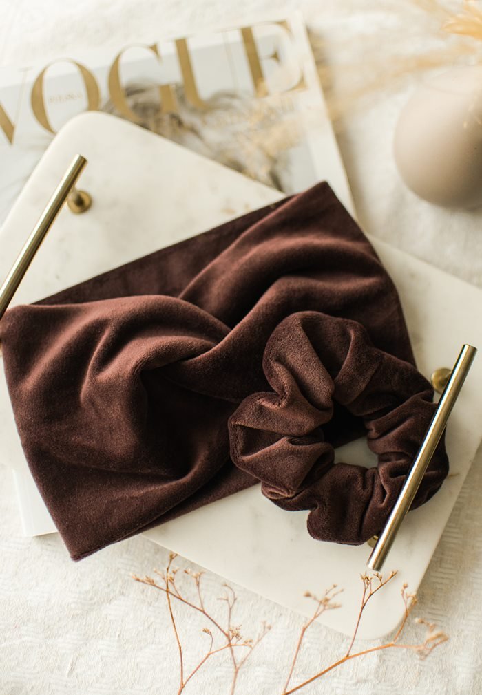 Zestaw opaska i gumka w kolorze czekoladowym z welurowego materiału. Miłe w dotyku.