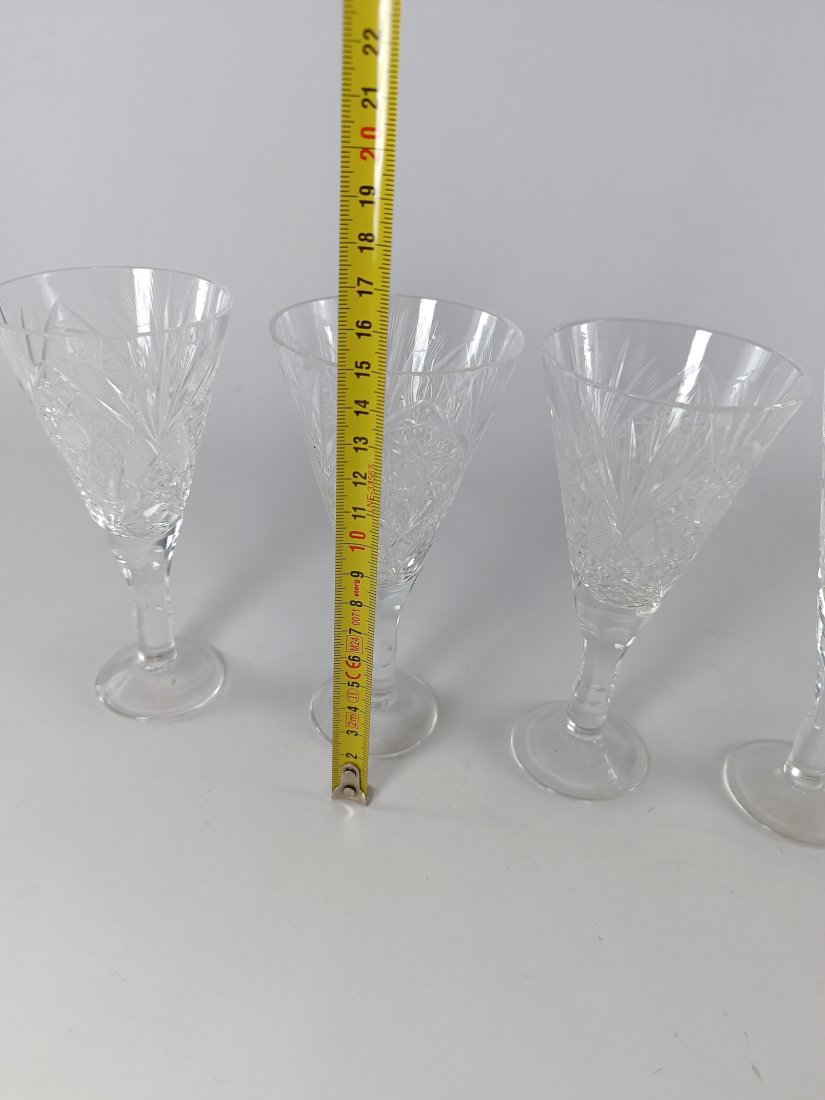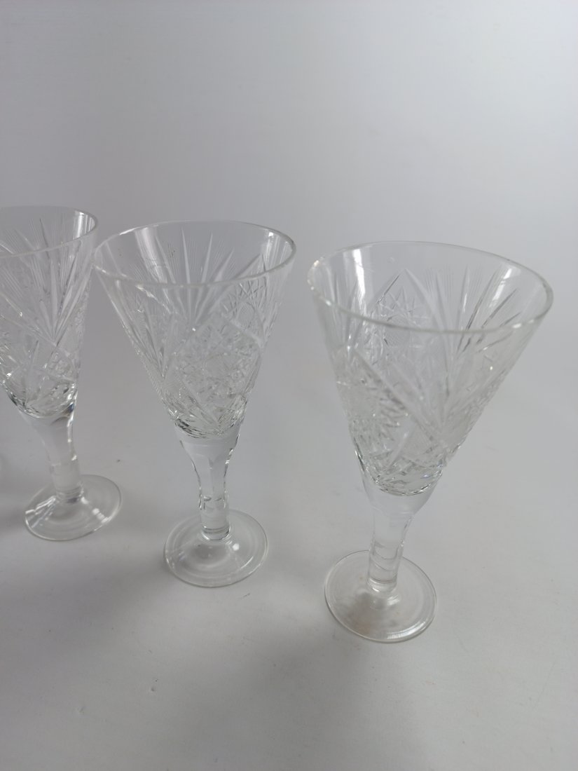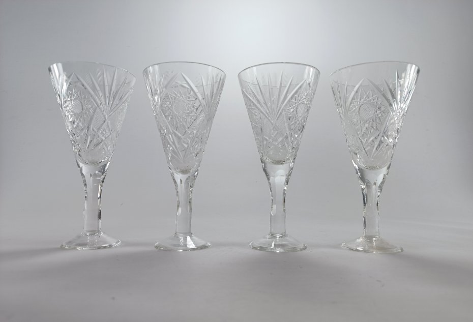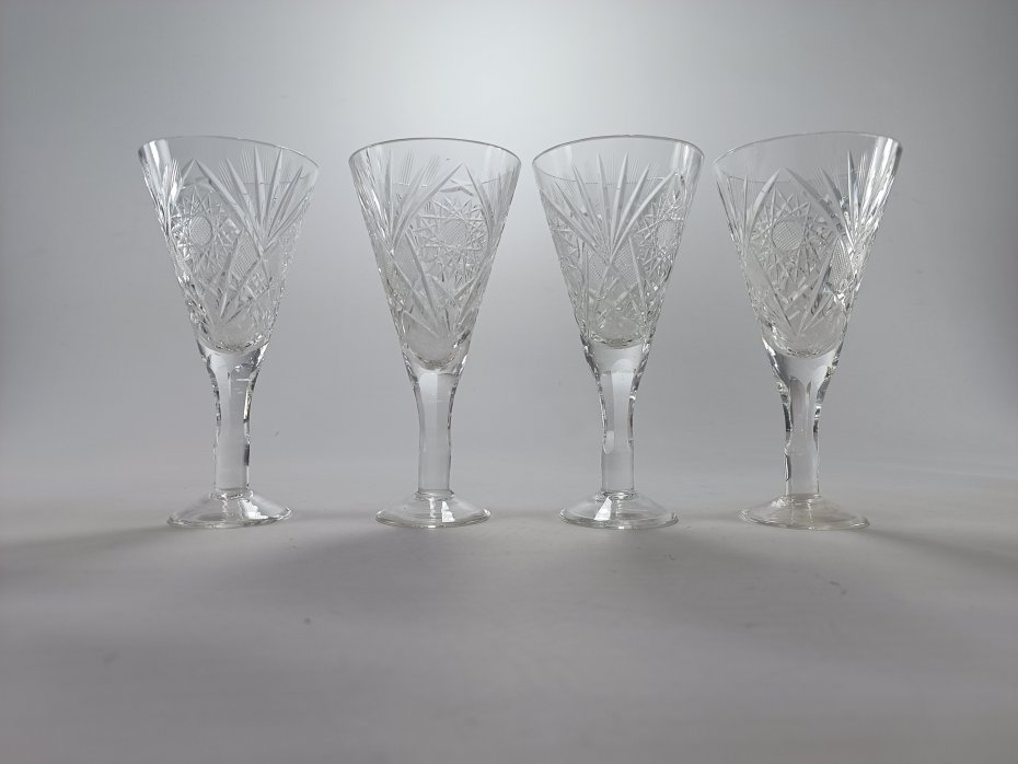 Zestaw czterech kryształowych kieliszków. Stan zachowania bardzo dobry, bez uszkodzeń.