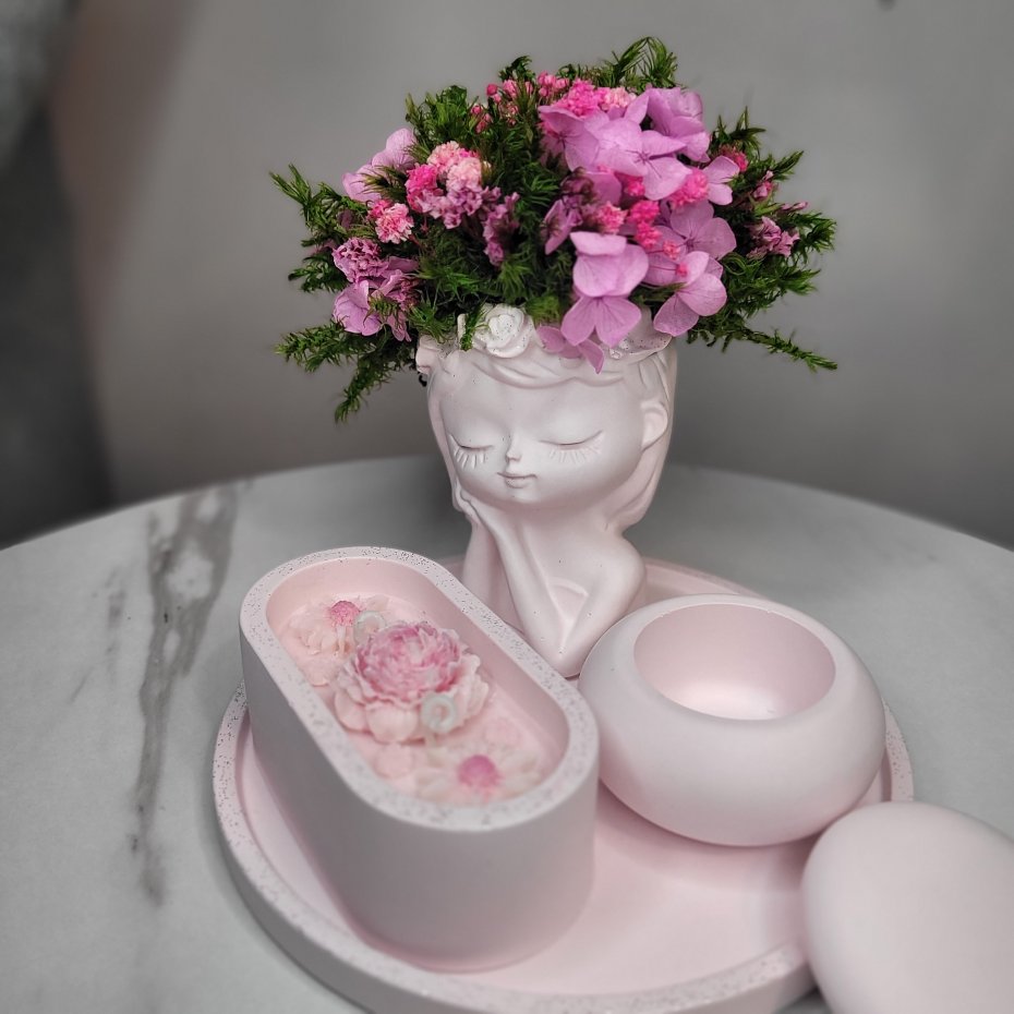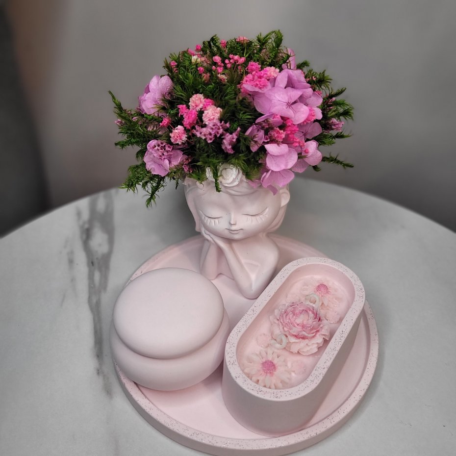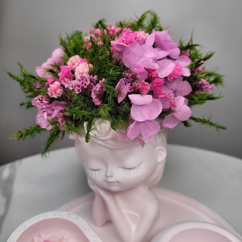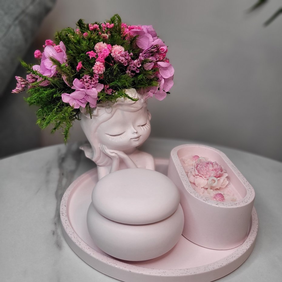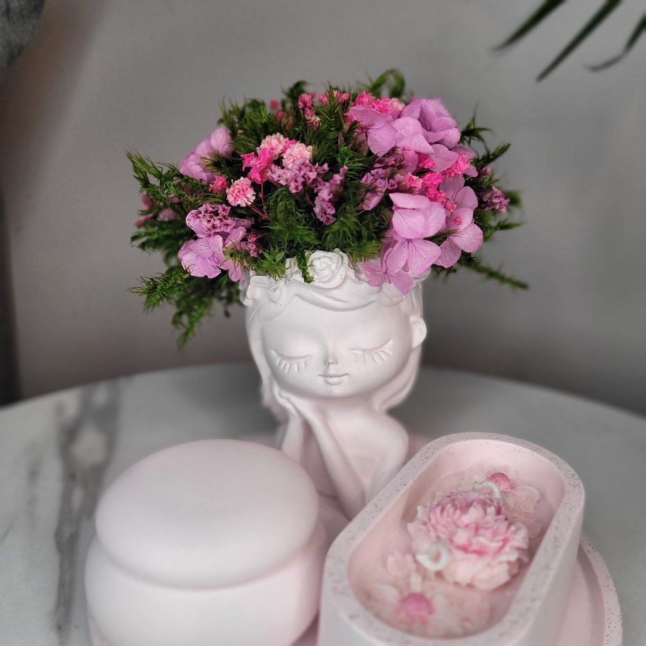 Zestaw składa się z delikatnej świecy oraz uroczej doniczki w kształcie dziewczynki. Jej "włosy" tworzy stabilizowany mech, ozdobiony subtelnymi kwiatami w pastelowych kolorach, co dodaje całości wyjątkowego uroku.