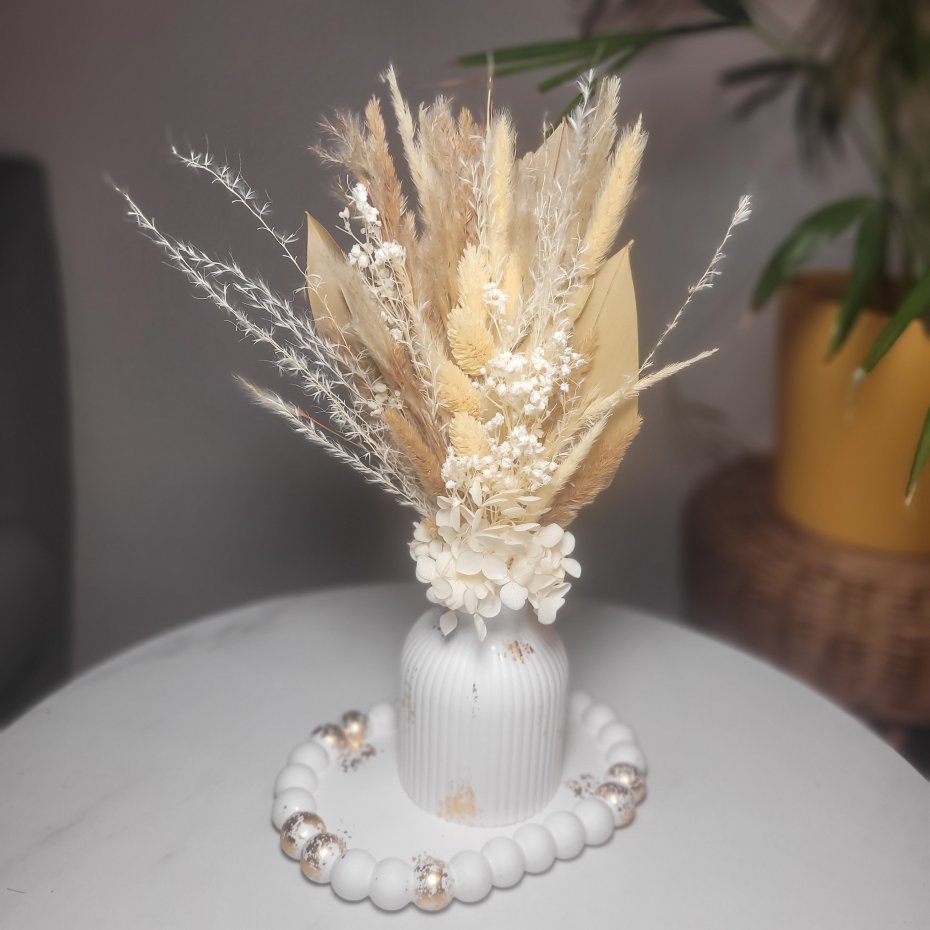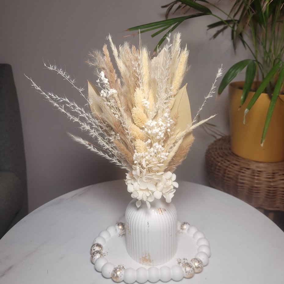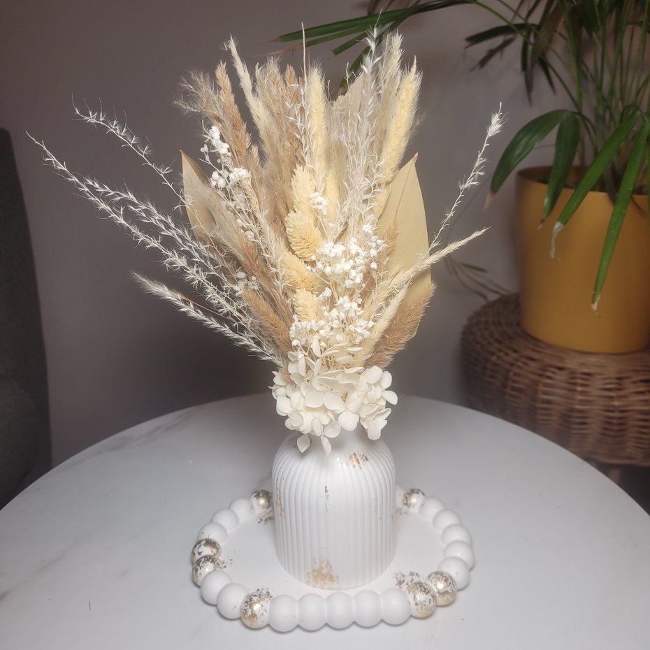 Oryginalny wazon z gipsu z eleganckimi suszonymi kwiatami, które dodadzą przytulności Twojemu wnętrzu.